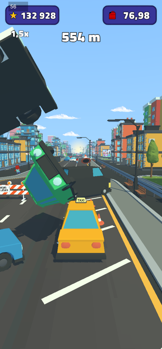 Infinite runner where you drive a taxi, pick up and drop off passengers and plow through obstacles.